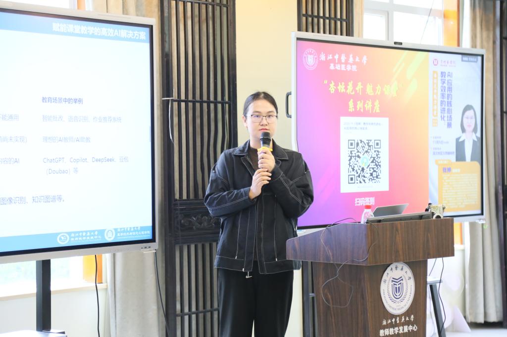 为推动人工智能与教育教学深度融合,提升课堂教学效率与质量,11月5日14:00,基础医学院在滨文校区文苑咖啡吧举办“杏坛花开魅力课堂”系列讲座之“教学效率的进化:AI应用的核心场景”。本次讲座特邀浙江中医药大学教师教学发展中心副主任张婷副教授担任主讲人。会议由基础医学院本科教学办副主任张倩主持。