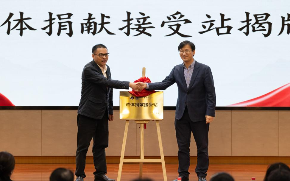 随后,在全场师生的共同见证下,张孚传秘书长与黄建波副校长携手为“浙江中医药大学遗体捐献接受站”揭牌。这标志着学校在生命教育与医学实践融合方面迈出关键一步,这也是学校为捐献者与医学生之间搭建传递爱心、延续生命桥梁的重要举措。