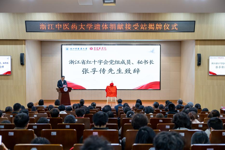 遗体捐献,是一项奉献自我、泽被后人的崇高善举,是推动医学科学进步、培养卓越医学人才不可或缺的基础环节。2025年11月11日,浙江中医药大学图书馆报告厅内举行了遗体捐献接受站揭牌仪式,浙江省红十字会党组成员张孚传秘书长,浙江省人体器官捐献管理中心贺佳晶主任、曹燕芳科长、何炯老师和浙江省37例造血干细胞捐献者倪滨老师,特邀嘉宾遗体捐献志愿者毕九岗先生、学校基础医学实验教学中心主任毕晓晨老师,浙江中医药大学副校长黄建波,浙江中医药大学基础医学院院长朱爱松、副院长楼航芳与基础医学相关教研室老师和100余名医学生代表齐聚一堂,共同见证这一承载生命敬意与奉献精神的重要时刻。仪式由浙江中医药大学基础医学院副院长楼航芳主持。
